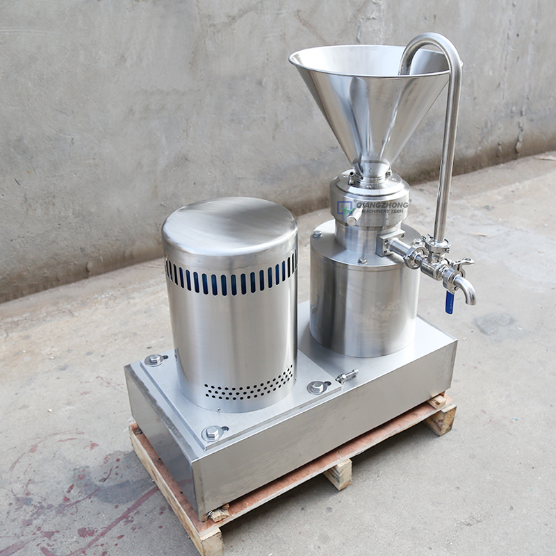 膠體磨的基本原理是流體或半流體物料通過高速相對連動的定齒與動齒之間,使物料受到強大的剪切力,磨擦力及高頻振動等作用。磨碎依靠磨盤齒形斜面的相對運動而成,其中一個高速旋轉,另一個靜止使物料通過齒斜面之間的物料受到極大的剪切力和摩擦力,同時又在高頻震動和高速漩渦等復雜力的作用下使有效地被粉碎、乳化、均質、溫合,從而獲得滿意的精細加工的產品。
